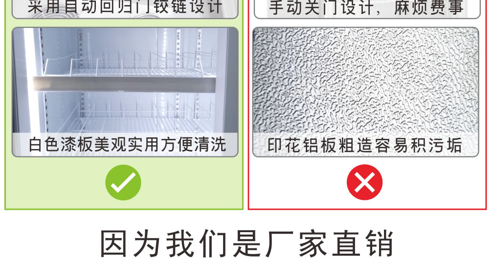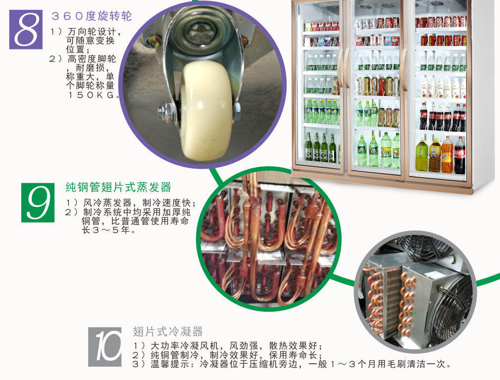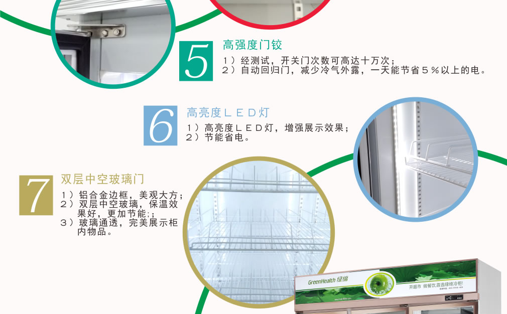 全封閉門封,不銹鋼層架勾,微電腦溫控器,EBM冷風機,高強度門鉸,高亮度LED燈,雙層中空玻璃門,360度旋轉輪,純鋼管翅片式蒸發器,翅片式冷凝器