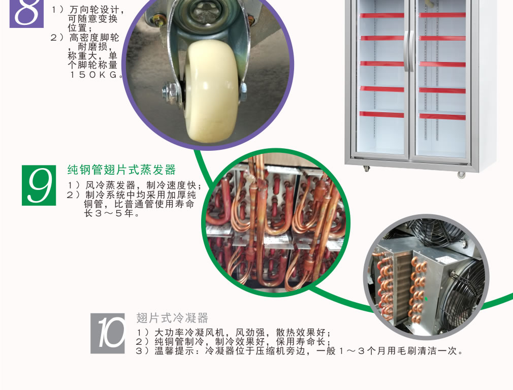 配備進口節能高效機組,一體式設計,真正做到低噪音,保證產品持久高效、環保、穩定;采用全優化高效3D立體制冷系統,能保證在均勻的溫度中,食品高保鮮度;