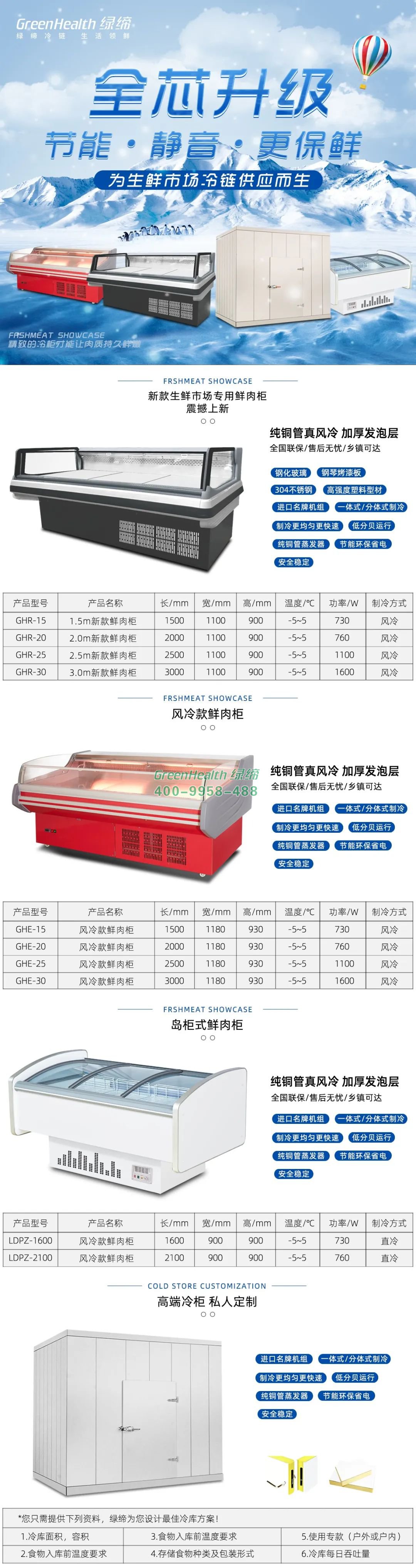 為此綠締冷鏈積極響應國家政策,研制推出最新款生鮮市場專用鮮肉柜,并結合綠締強大的智能冷鏈系統,為生鮮市場提供一套完善的冷鏈供應方案。廣東綠締冷鏈作為全國冷鏈供應著名品牌,力求為市場健康環境創鮮,為保證更新鮮、健康的食品而努力。